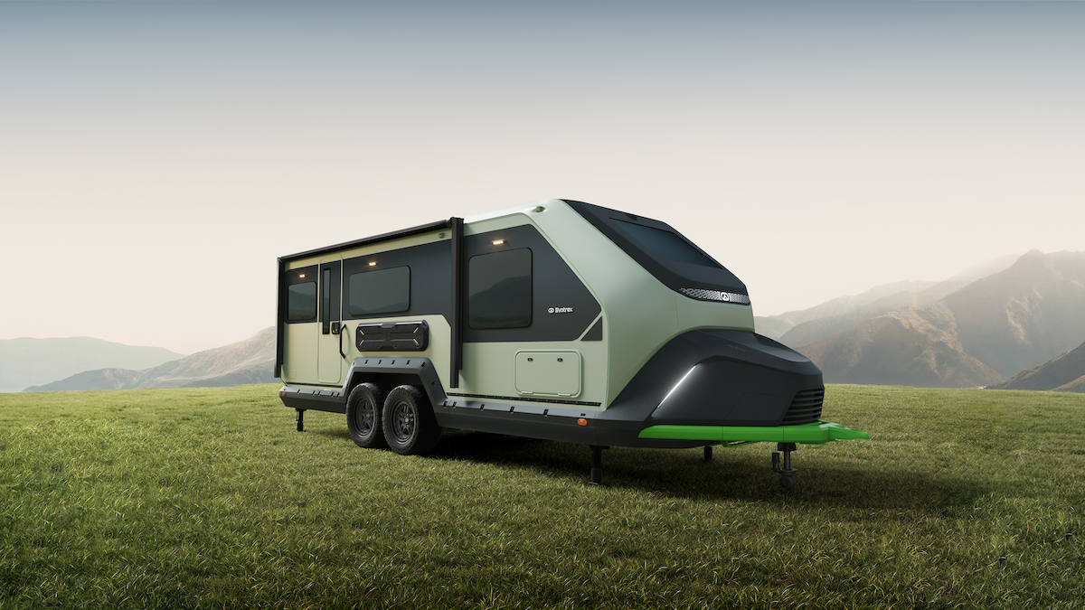 But that’s not to say you won’t have abundant power without running the generator- its 43 kWh lithium-iron-phosphate battery and 1.5 kW rooftop solar array are designed to offer plenty of power, but this Evotrex RV also features regenerative charging while towing. Not only that, but it offers a uniqueself-propulsion system that allows you to move and park the trailer remotely via it’s own hand-held tablet.